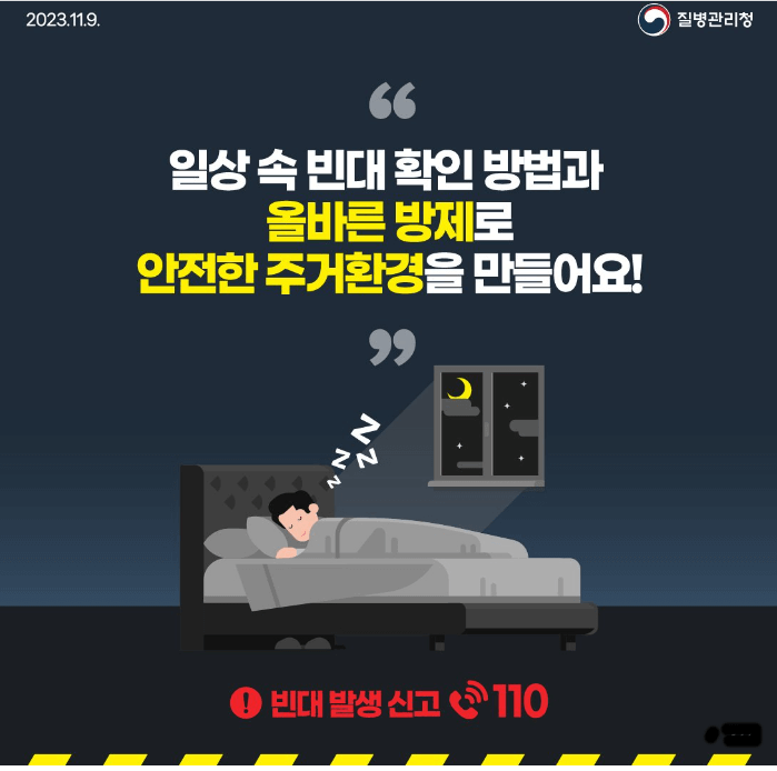 화학적 방제는 보조적으로 수행 빈대 예방법 빈대가 숨어있는 공간 확인 방바닥 또는 침대에 짐 보관지양 여행용품에 대한 철저한 소독 필요 일상 속 빈대 확인 방법과 올바른 방제로 안전한 주거환경을 만들어요! 빈대 발생 신고 ☎110